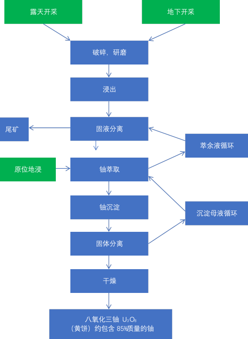 世界主要鈾礦的開采方式包括三種:原位地浸開采,露天開采及地下開采。世界約48%的天然鈾通過原位地浸開采生產(chǎn)出來,46%來自于常規(guī)開采方法(露天開采及地下開采)生產(chǎn)出來,6%作為其他礦產(chǎn)品副產(chǎn)品采出。 鈾礦開采生產(chǎn)工藝示意圖 2017年世界各國產(chǎn)鈾比例(總產(chǎn)量為59,531噸鈾) 原位地浸開采 原地浸出采鈾是將溶浸液通過注液鉆孔注入到可滲透的含礦含水層,使溶浸液在滲透過程中與鈾接觸并進行溶解反應,生成含鈾溶液,并從抽液孔被抽至地表,輸送到車間加工處理后獲得鈾產(chǎn)品的流程。 ? 適用賦存于含水及可滲透砂巖中鈾礦物開采。 ? 圈定鈾礦的邊界品位為0.001%。 ? 根據(jù)浸出機理的不同,分為酸法和堿法開采。 開采的適用條件: (1)含礦巖性應為具有滲透性的砂巖、砂礫巖。礦體賦存于地下水位以下的含礦含水層中。充水性和滲透性是地浸是否可行的決定性因素。 (2)礦體產(chǎn)狀平緩(傾角一般小于10度),礦體頂?shù)装鍛橇己梅忾]的不透水層。 (3)礦床平米鈾量應在最低經(jīng)濟指標之上,含礦含水層中碳酸鹽含量>2%則不宜用酸法浸出。圍巖以長石石英質(zhì)或石英質(zhì)砂巖最宜。 (4)按照目前鈾價,開采礦體最大埋藏深度不宜超過400-600m。 浸出機理 酸法 主要使用硫酸作為溶浸劑,礦石中鈾隨溶浸液pH值的下降2以下后從沉淀態(tài)變?yōu)槿芙鈶B(tài),生成硫酸鈾酰溶液。含礦含水層中碳酸鹽含>2%則不適用。 堿法 主要使用碳酸氫銨作為溶浸劑,礦石中鈾隨溶浸液pH值上升到9以上后礦石中的6價鈾與碳酸鹽中的碳酸根(CO32-)絡合,生成碳酸鈾酰溶液。產(chǎn)品液鈾含量低,銨鹽也造成地下水污染。 二氧化碳+氧氣 原理是氧氣氧化礦石,在地下水中加入二氧化碳后,形成的碳酸氫根(HCO3-)離子與礦層中的鈾發(fā)生反應,使鈾溶解在溶液中,也屬于堿法浸出分類。 細菌浸出 主要選用氧化鐵硫桿菌,在浸出鈾的過程中,主要起間接催化作用,能促進黃鐵礦和硫酸亞鐵的氧化,促進6價鈾生成。可降低酸耗。需配合酸法使用,但并非一種獨立的浸出方法。 地浸的主要優(yōu)點: (1)開采方法安全簡單、工藝流程短。采礦階段無需搬運、破碎礦石,水冶階段無需磨礦和固液分離,縮短了采冶工藝流程,直接生產(chǎn)成本低。 (2)礦山建設周期短、基建投資少,勞動強度低、自動化程度高,固定資產(chǎn)折舊低。 (3)環(huán)境污染小。一是抽注基本平衡,地浸溶液是在閉路管道內(nèi)循環(huán)使用,其廢水排放量顯著減少;二是放射性粉塵污染得到徹底改善;三是尾渣和廢氣的污染減到了最低程度。 露天開采即一個移走礦體上的覆蓋物,從敞露地表的采礦場采出鈾礦物的過程。主要適用于主礦體埋藏較淺的鈾礦床開采。 主要優(yōu)點包括: 1. 基建周期短。2-4年/大型 6-8月/小型。 2、開采空間大,勞動生產(chǎn)率高。比地下開采高2-10倍。 3、礦石損失、貧化率較小。損失率3%-5%貧化率5%-8%。 4、開采成本低,勞動條件好,生產(chǎn)安全。 主要缺點: 1、開采受到氣候影響大。 2、基建設備投資大。 3、礦山占地多,對地表環(huán)境破壞大。 地下開采即通過開掘井巷工程從地下礦床的礦塊里采出礦石的過程,通過礦床開拓、礦塊的采準、切割和回采4 個步驟實現(xiàn)。主要適用于埋藏較深及地表不允許露天開采的鈾礦床。以地壓管理方法為依據(jù),分為空場采礦法充填采礦法、崩落采礦法三大類。
